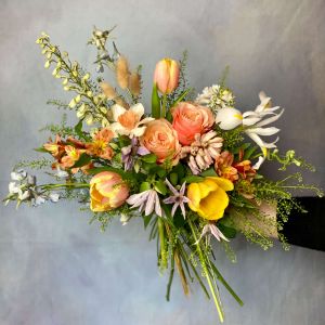 Full of warmth and elegance, this bouquet features a harmonious blend of soft apricot-toned blooms. This fresh bouquet is ready to be unwrapped and dropped into your favorite vessel! (flowers may vary based upon availability)