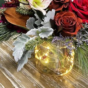 Rich seasonal tones, textures, and a light-up vase create a welcoming glow perfect for any winter space.