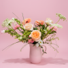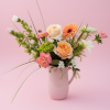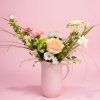 Beautifully balanced, fresh roses, daisies and greenery arranged in a keepsake soft pink large pitcher. (item may vary slightly based on availability)