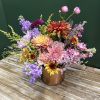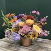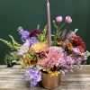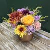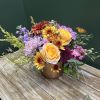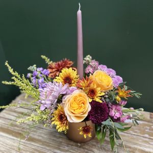 A rich seasonal design blending soft lilac tones with warm copper accents for a modern autumn feel. Available with or without a coordinating candle for an elegant fall, Thanksgiving, or holiday centerpiece. (flowers/colors/vessel may vary depending upon availability)
