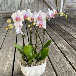 These mini phal orchids are gorgeous little gifts and now feature 3 beautiful bloom-packed stems! Assorted colors. (colors and pot may vary)