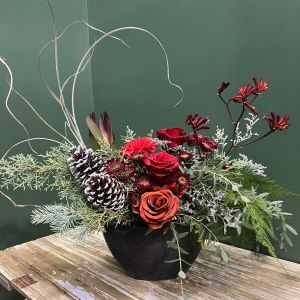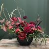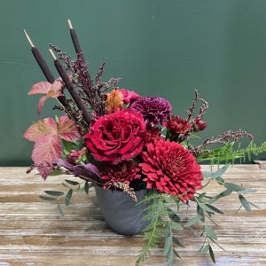 Deep berry and crimson tones come together in a lush, textural design that’s both bold and refined. A striking centerpiece for fall gatherings and holiday celebrations. (flowers/colors/vessel may vary depending upon availability)