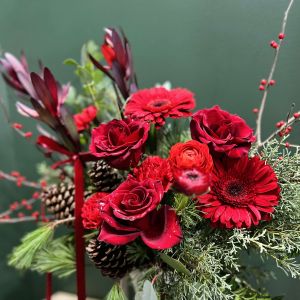 Rich red blooms are gathered with textured evergreens, winter berries, and natural accents, creating a warm, elegant feel. (may vary from photo)