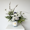 An airy, garden-style arrangement of soft whites, periwinkle and purples in a keepsake vase (item may vary based on availability.)