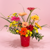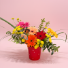 Vibrant blooms and butterfly in a cute red or orange polka dot pot. (item may vary slightly based on availability)